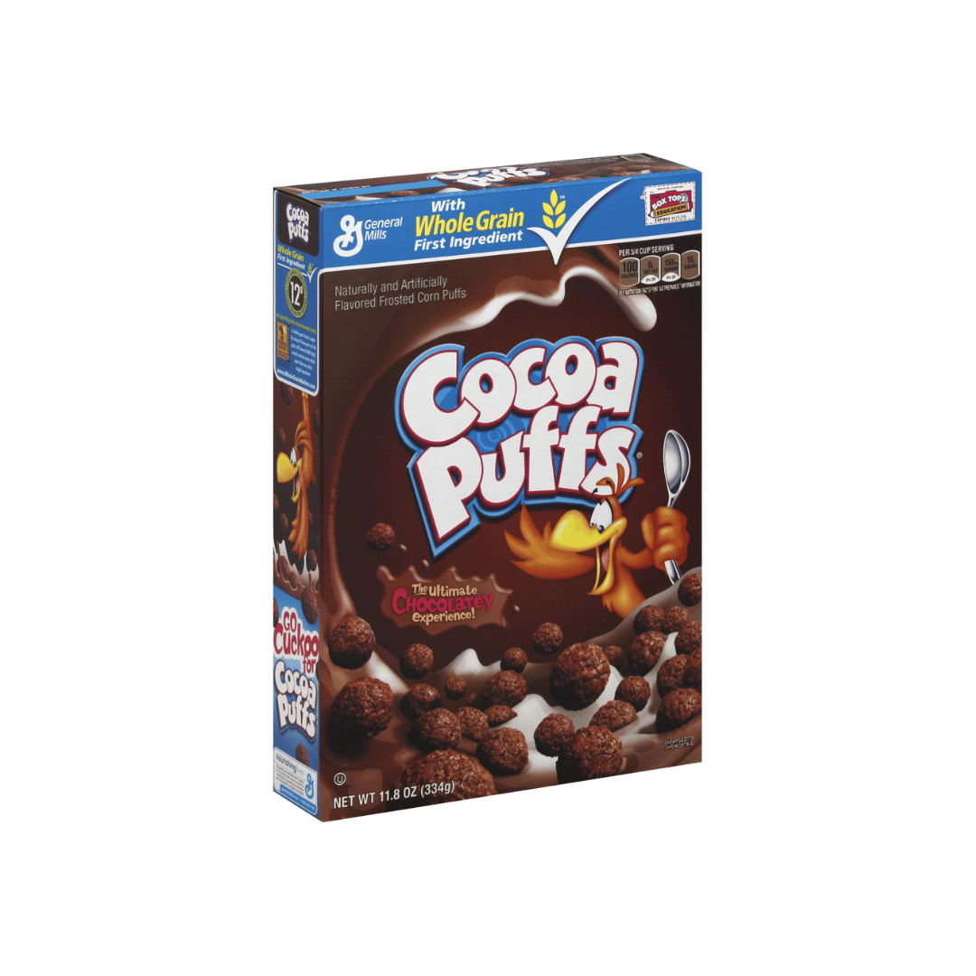 General Mills Cocoa Puffs features crunchy, chocolate flavored corn puffs coated with a frosted cocoa finish. Each bowl delivers a rich chocolate taste that turns milk deliciously cocoa flavored, making it a fun breakfast choice for kids and chocolate lovers.